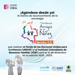 La estrategia Territorios Amigos de la Niñez 2.0, llega a la última fase de un proceso que comenzó en 2019, desde el reconocimiento de su primera ronda de territorios que tienen un enfoque de niñez. para ello, el próximo 14 de diciembre de 2023 se realizará en la ciudad de Bogotá D.C. el evento de reconocimiento a los esfuerzos y avances logrados por los 78 territorios participantes en la versión 2.0 de la Estrategia Territorios Amigos de la Niñez – 2020-2023.